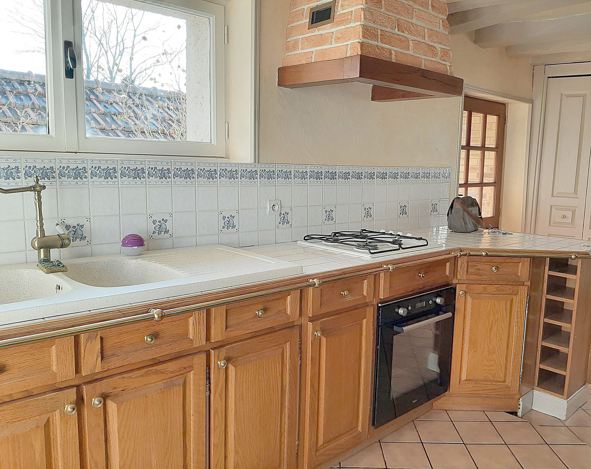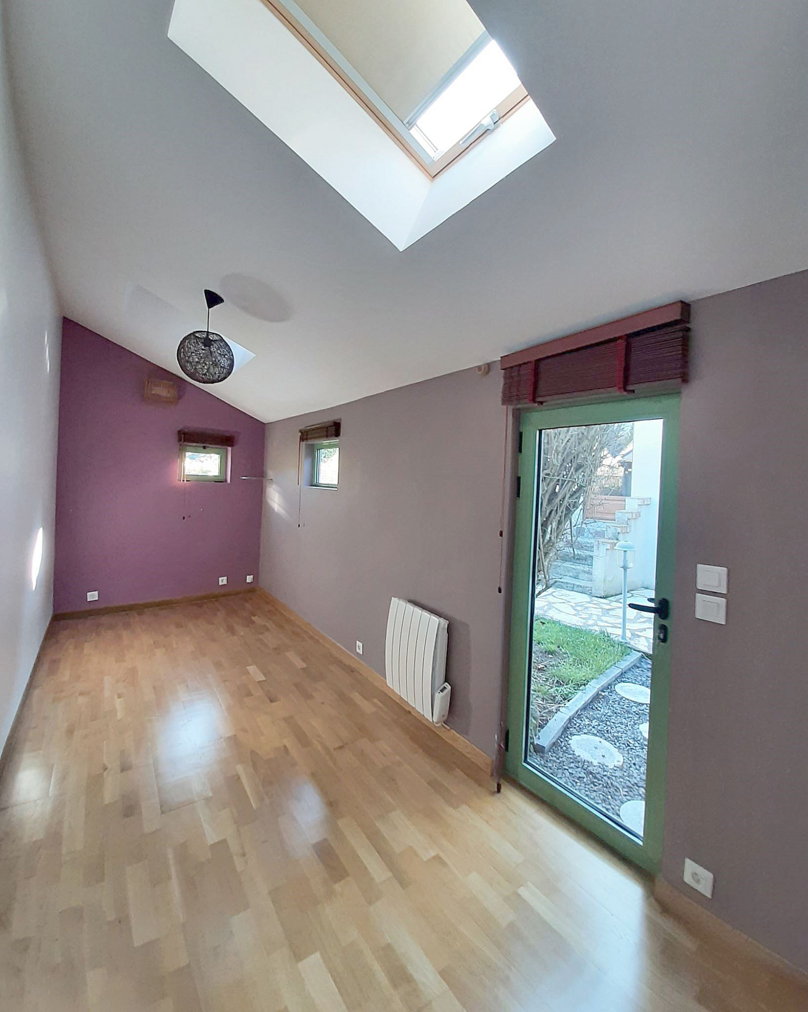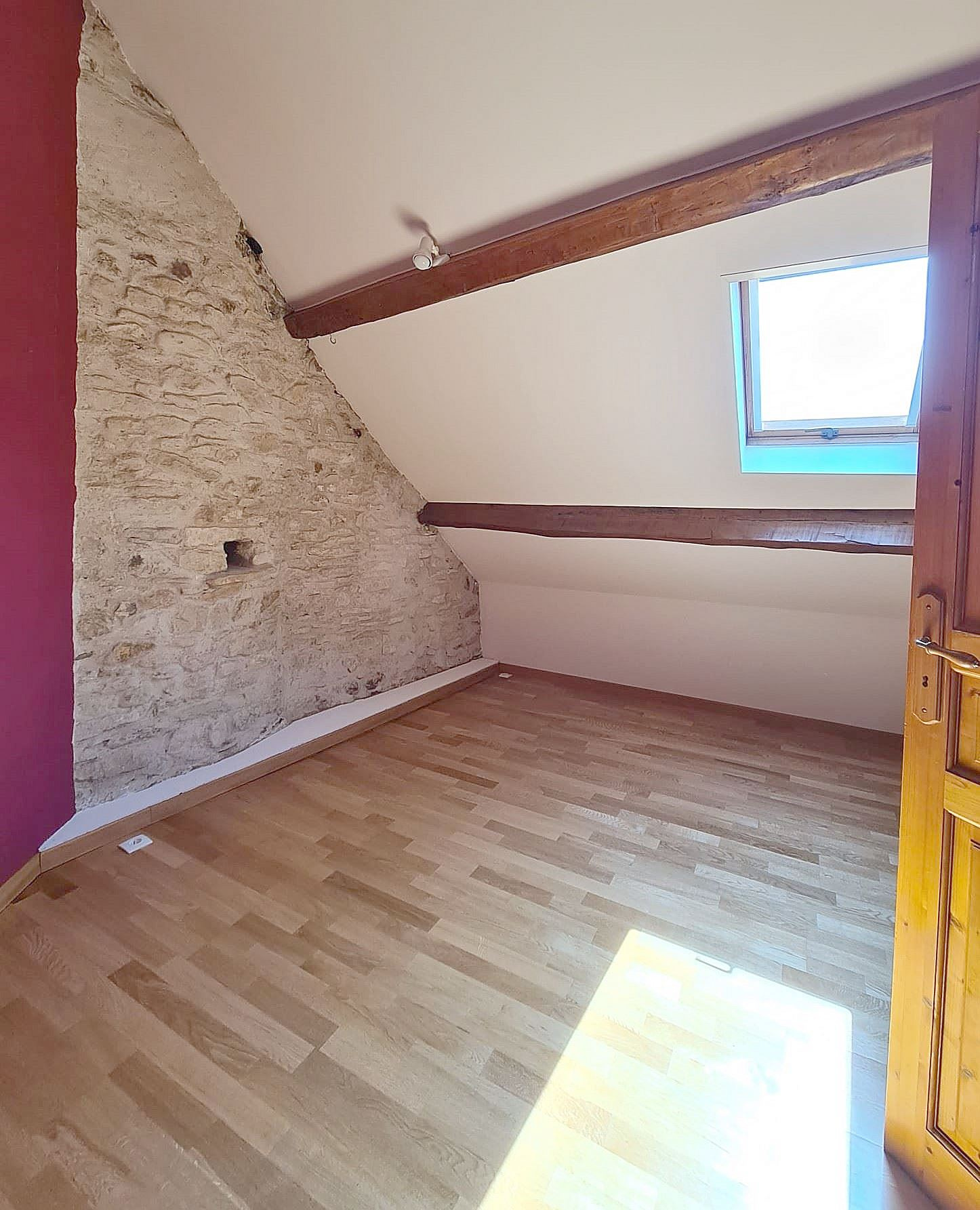 Maison atypique de 120 m² offrant au rez-de-chaussée une entrée avec une belle cuisine aménagée et équipée (plaque, four, hotte, frigo) avec un coin repas, une salle de bains avec WC, un séjour avec cheminée, un dressing et une chambre. À l'étage se trouvent un palier et deux chambres. Une dépendance attenante à la maison avec un escalier intérieur, deux caves voûtées et un jardin de 230 m² sont également présents. Disponible à partir du 12 MAI 2026.